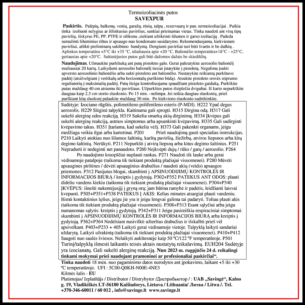 Purškiamos termoizoliacinės putos SAVEXPUR 850 ml